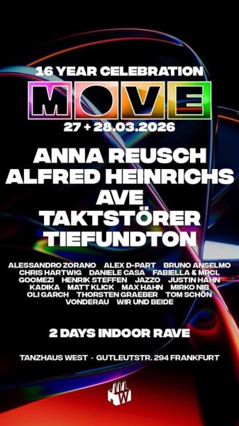 Die gefeierte DJ und Produzentin Anna Reusch ist bekannt für ihren kraftvollen, melodischen und gleichzeitig kompromisslos treibenden Sound. Zwischen Peak-Time-Techno, hypnotischen Elementen und emotionalen Breaks schafft sie es immer wieder, Dancefloors komplett in ihren Bann zu ziehen. Genau diese Energie macht ihren Auftritt bei „Move: 16 Years“ zu einem der Highlights des Abends.